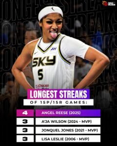 She just passed A’ja Wilson (2024 MVP), Jonquel Jones (2021 MVP), and Lisa Leslie (2006 MVP) — all of whom accomplished the feat three times in a row at their respective peaks. Reese did it as a rookie.